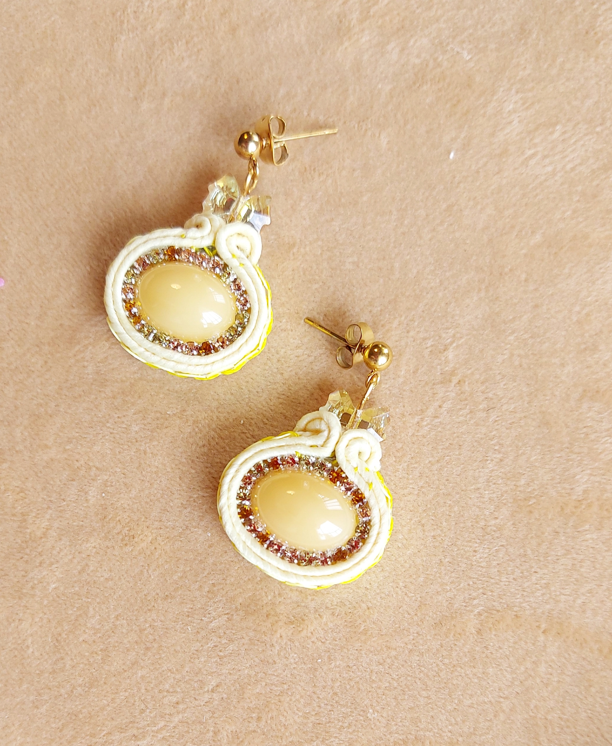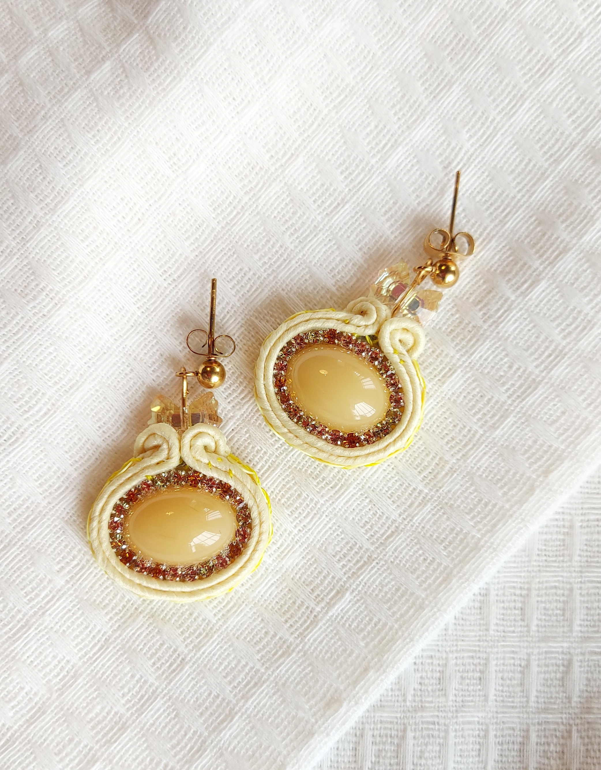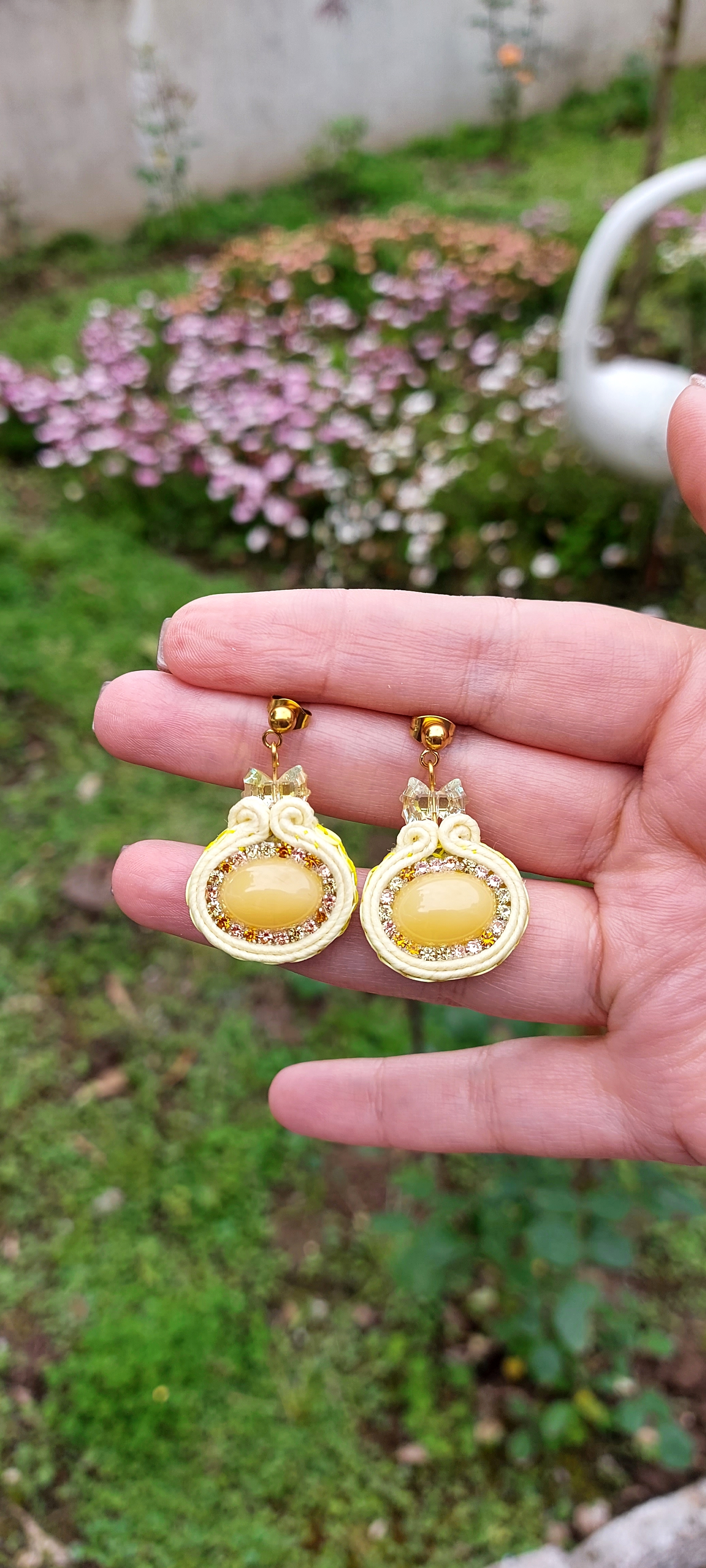 گوشواره درباریدوزی با سنگ طبیعی، قیطون روسی، نگین متری، پاپیون کریستال سواروسکی و پایه میخی ساچمهای استیل رنگ ثابت