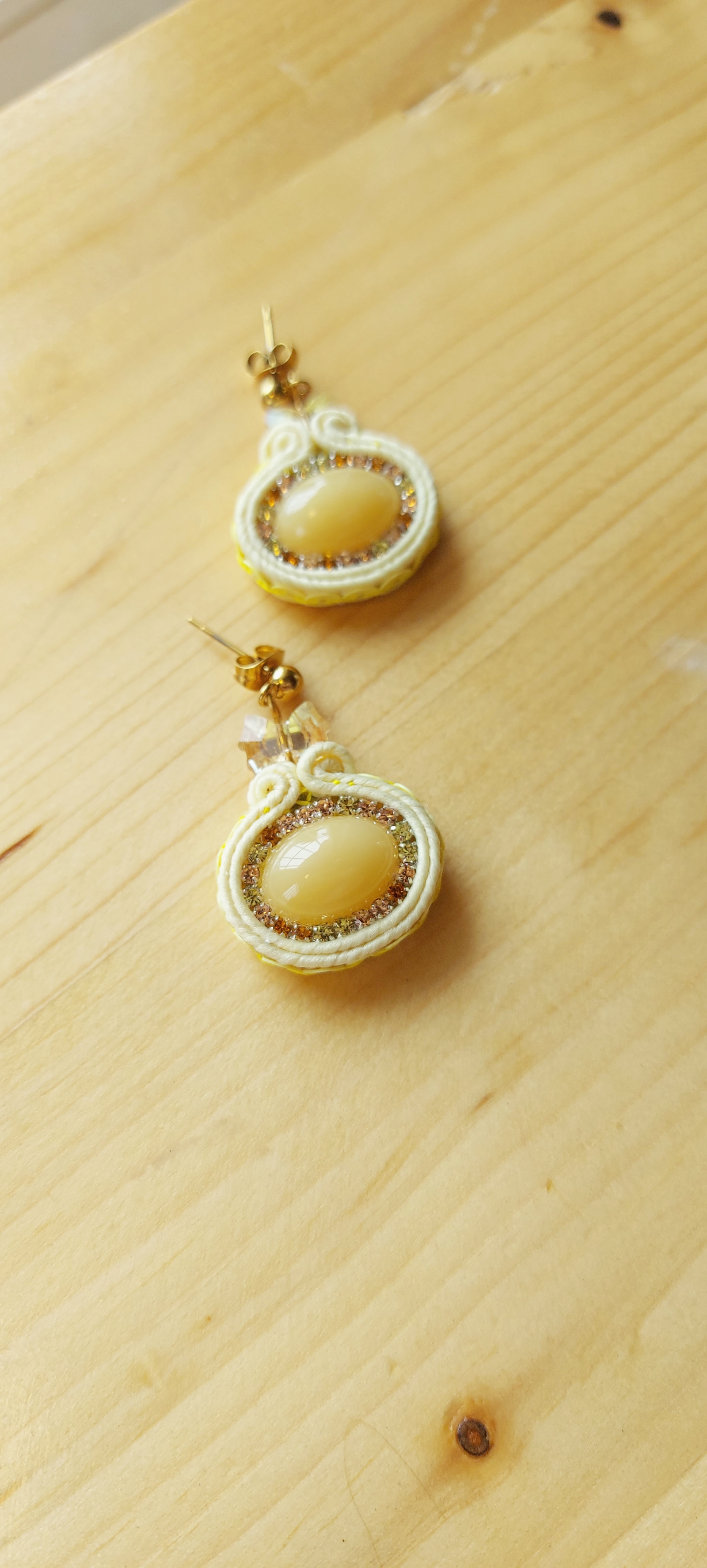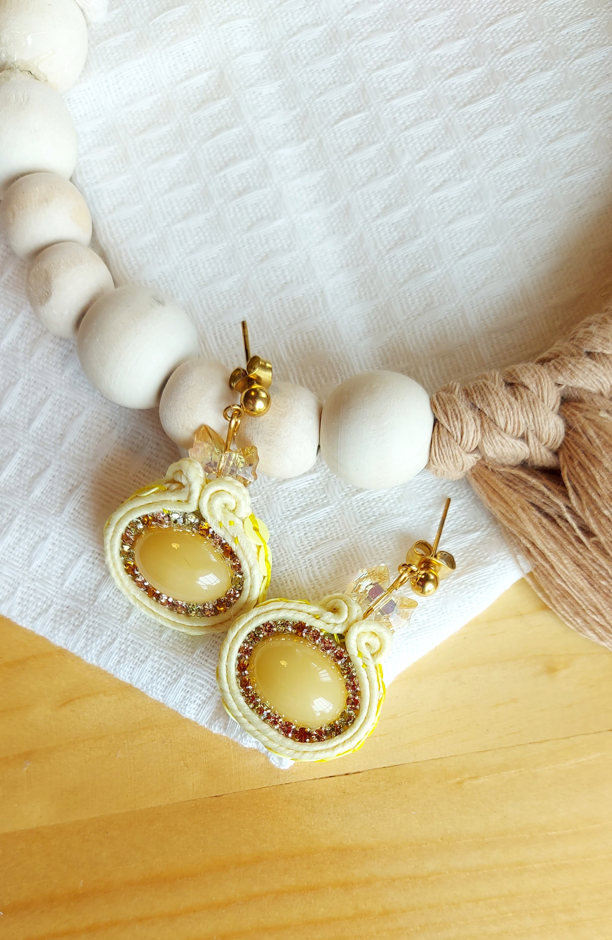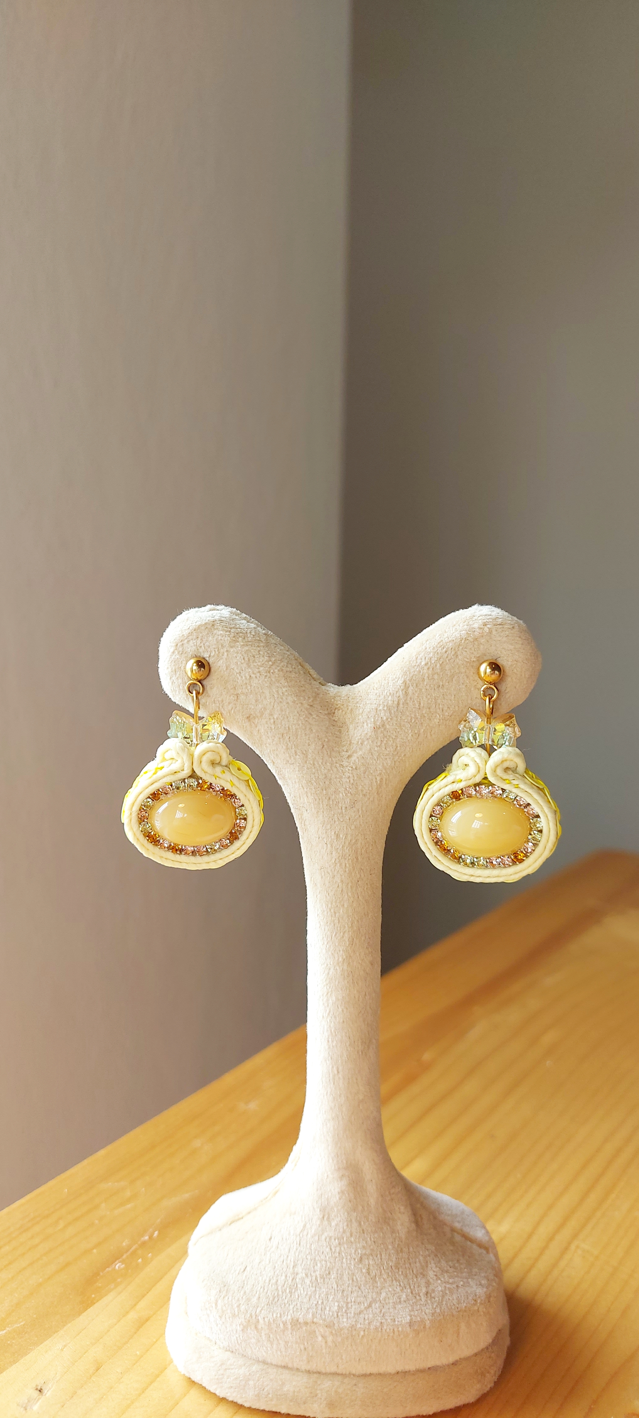 گوشواره درباریدوزی با سنگ طبیعی، قیطون روسی، نگین متری، پاپیون کریستال سواروسکی و پایه میخی ساچمهای استیل رنگ ثابت