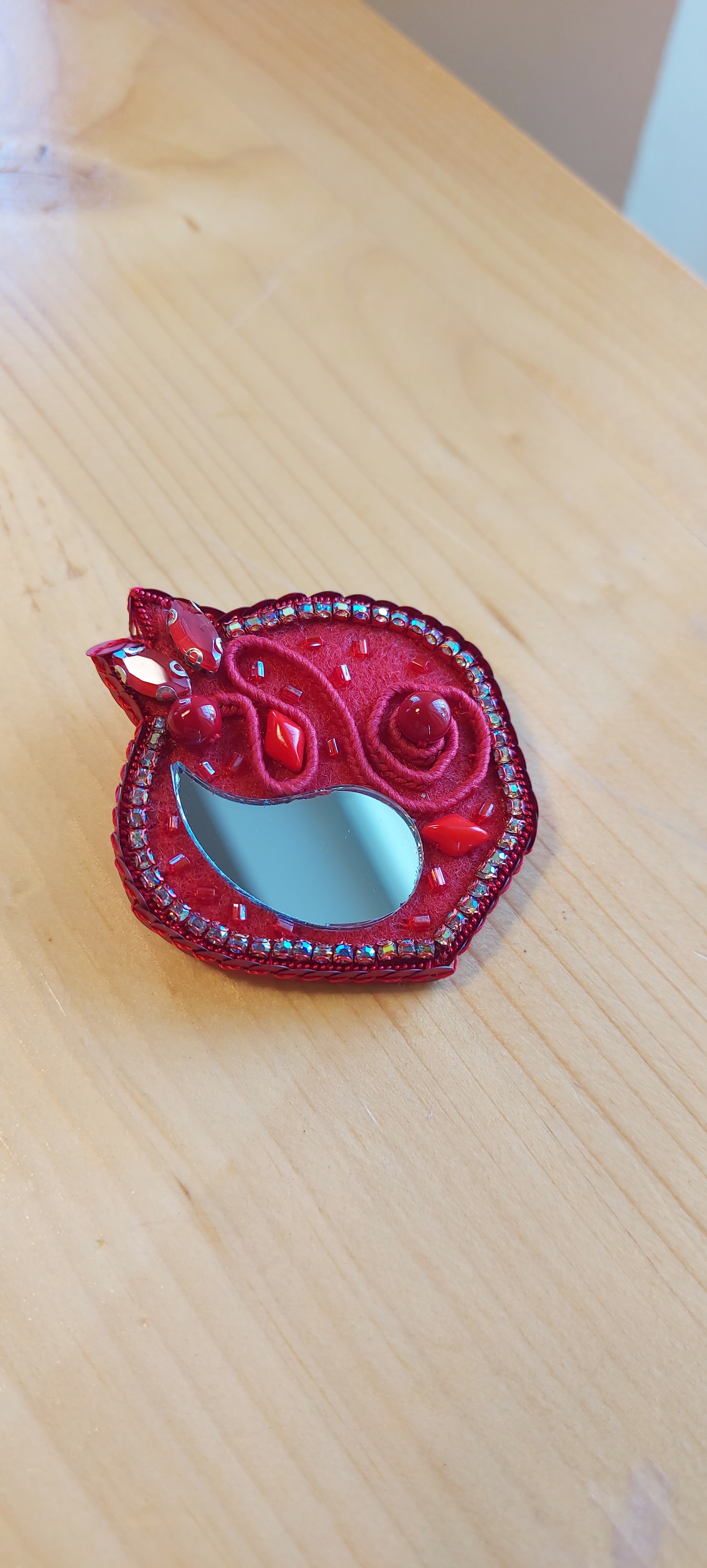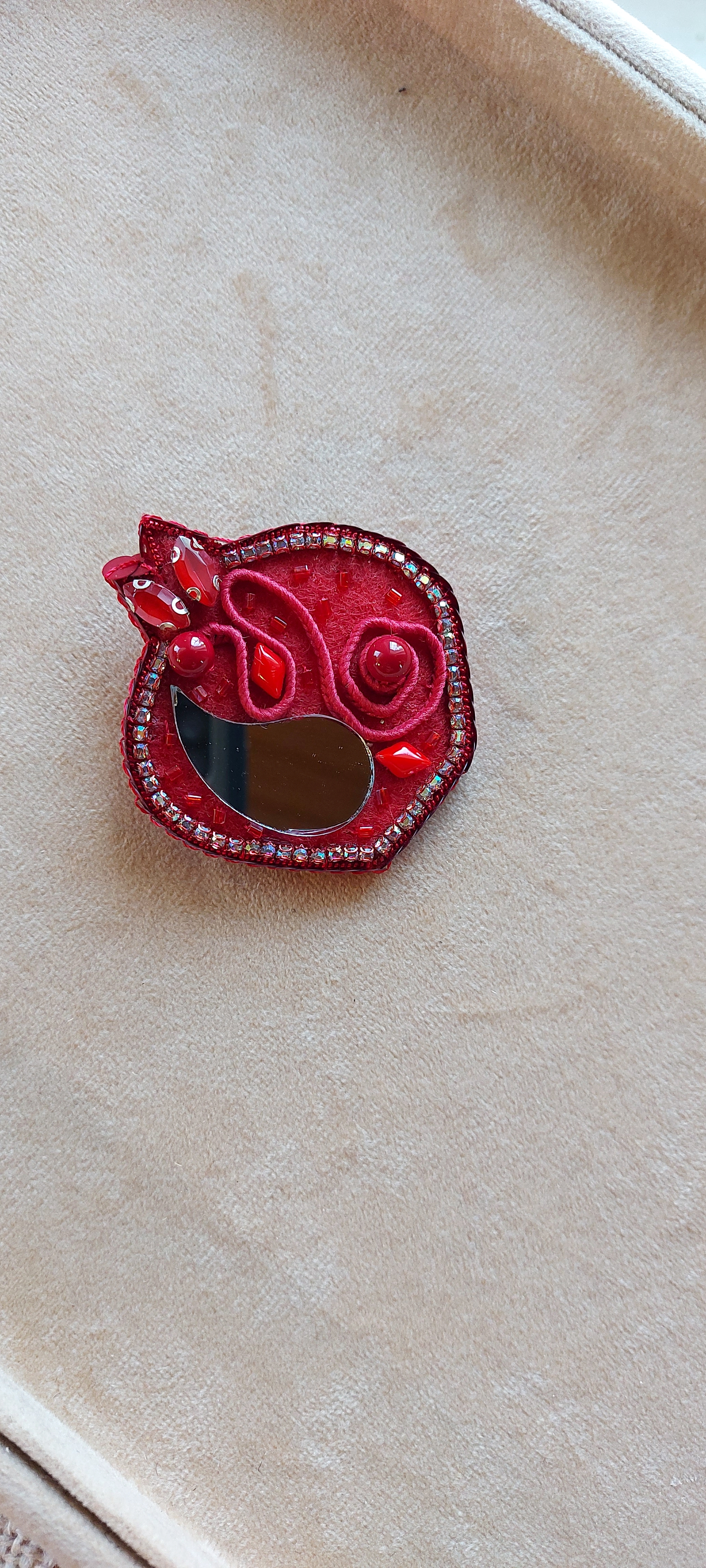 گلسینه جواهردوزی انار با آینه، قیطون روسی، مروارید سواروسکی، مهره ماتابو، نگین هایکپی سواروسکی و نگین متری