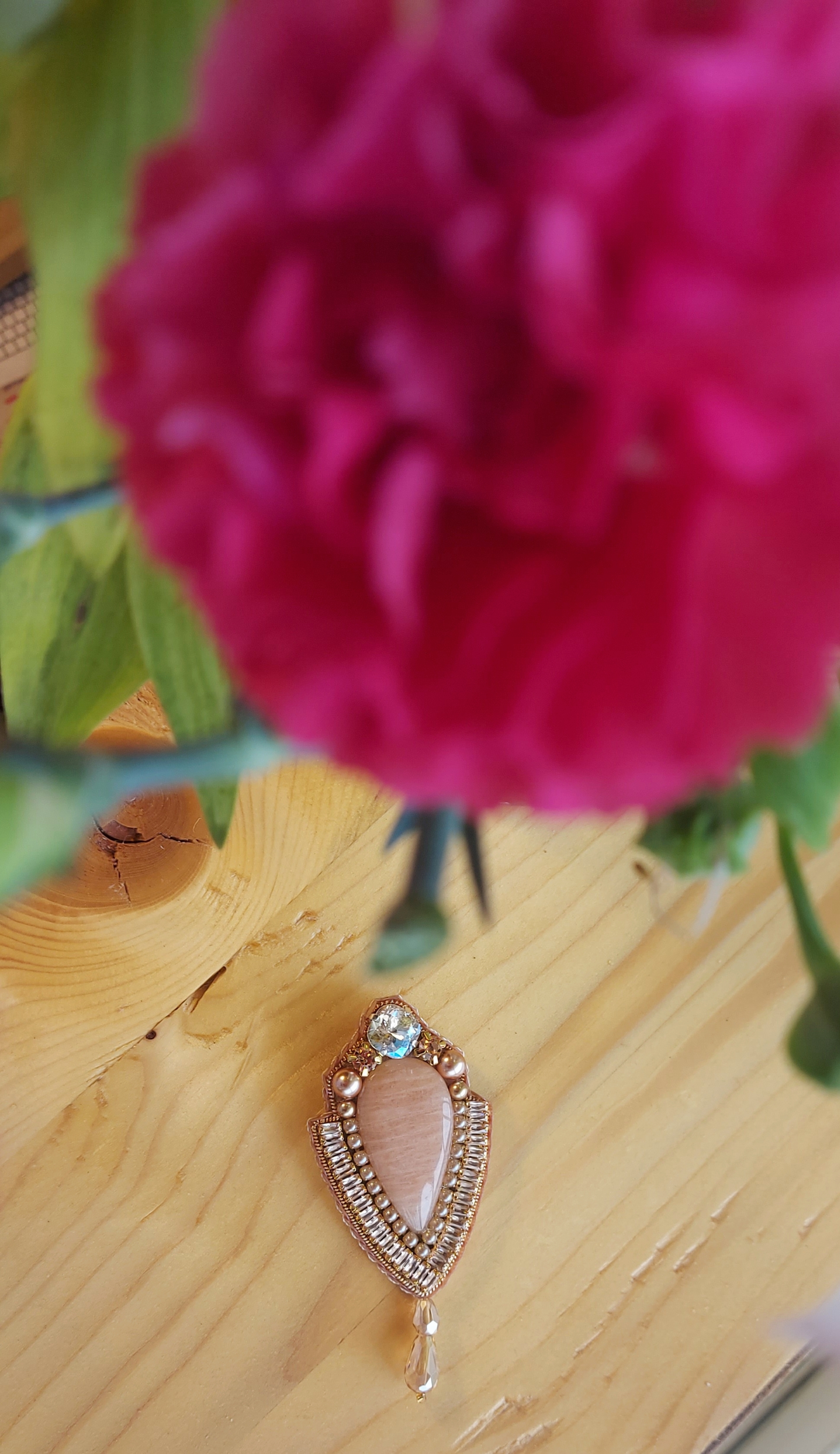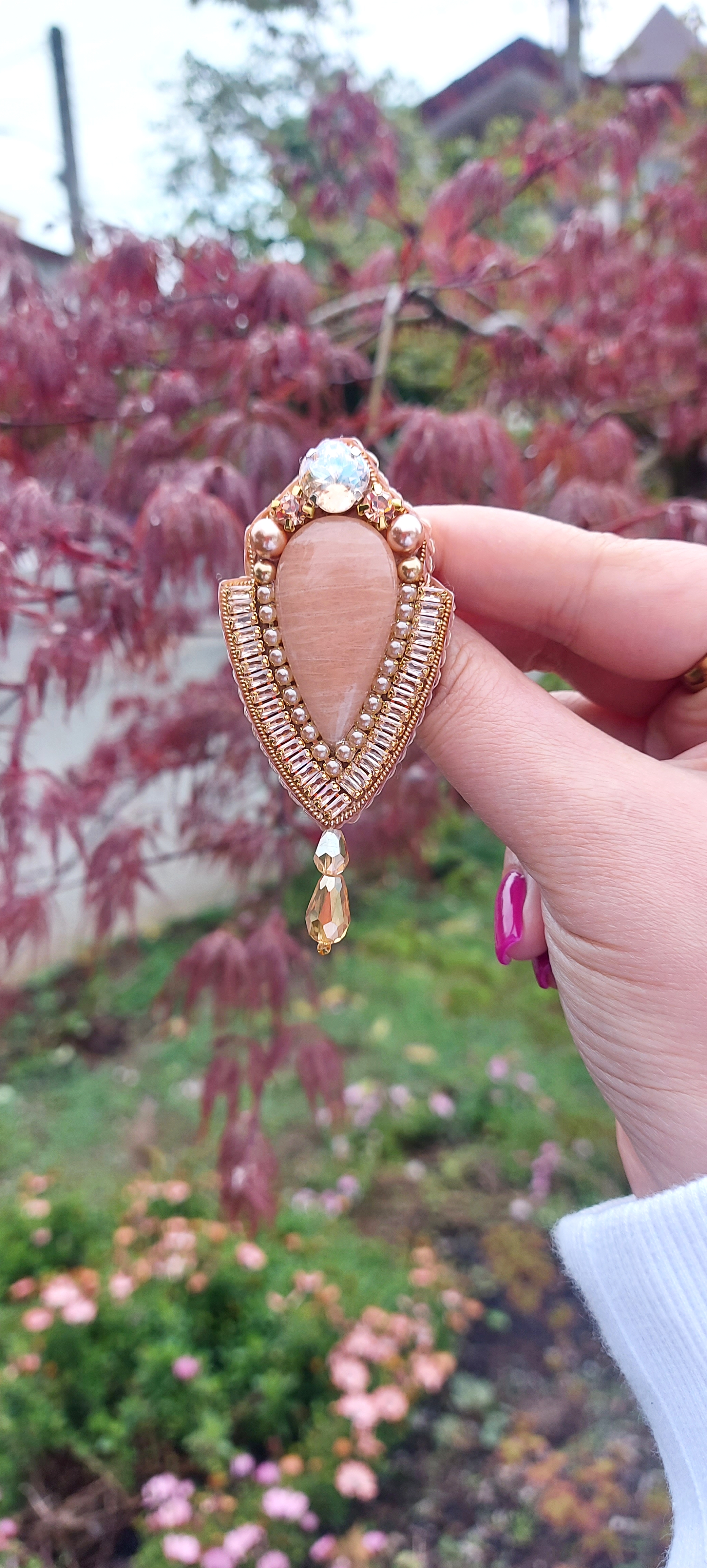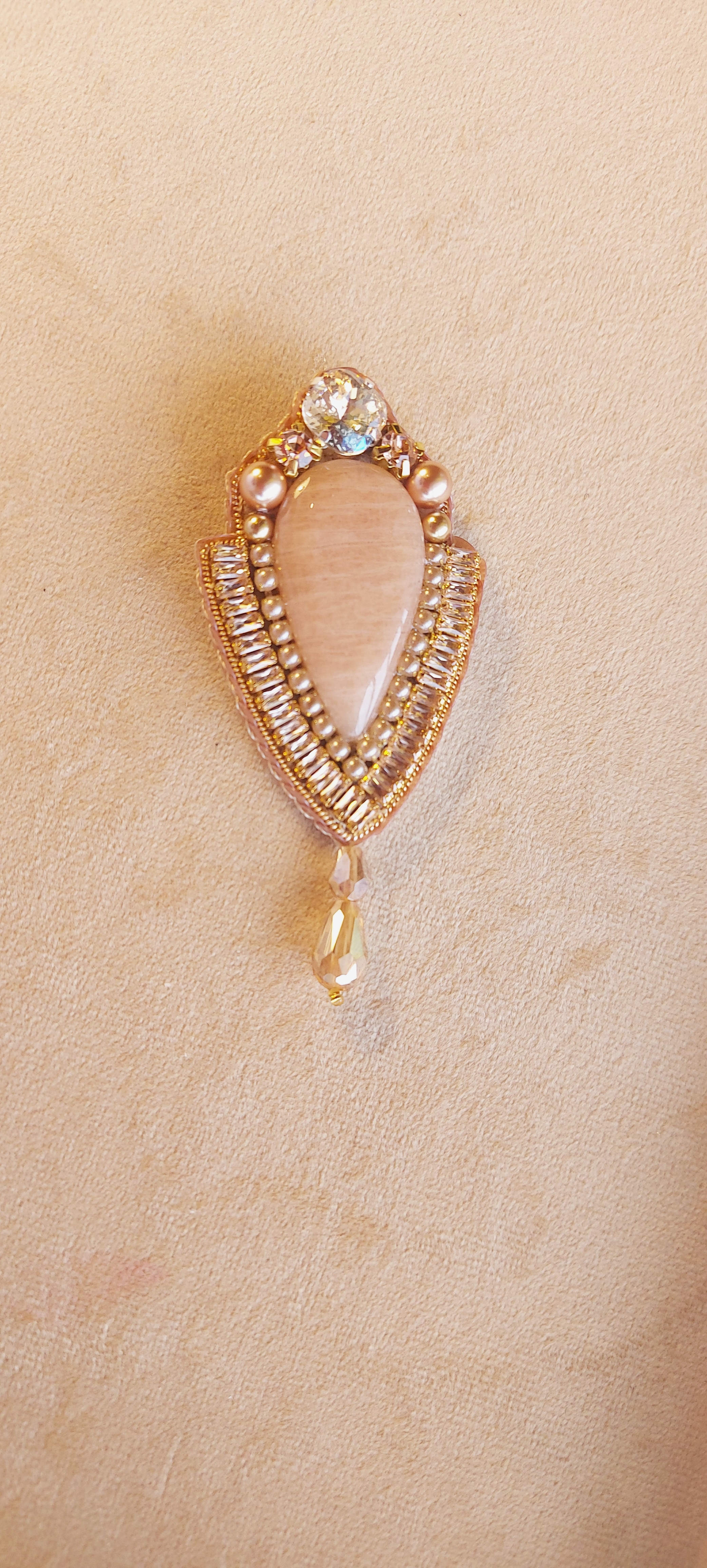 گلسینه جواهردوزی سنگ طبیعی با باگت زیرکنیا، نگین مرواریدی، نگین سواروسکی، مروارید سواروسکی و آویز کریستال