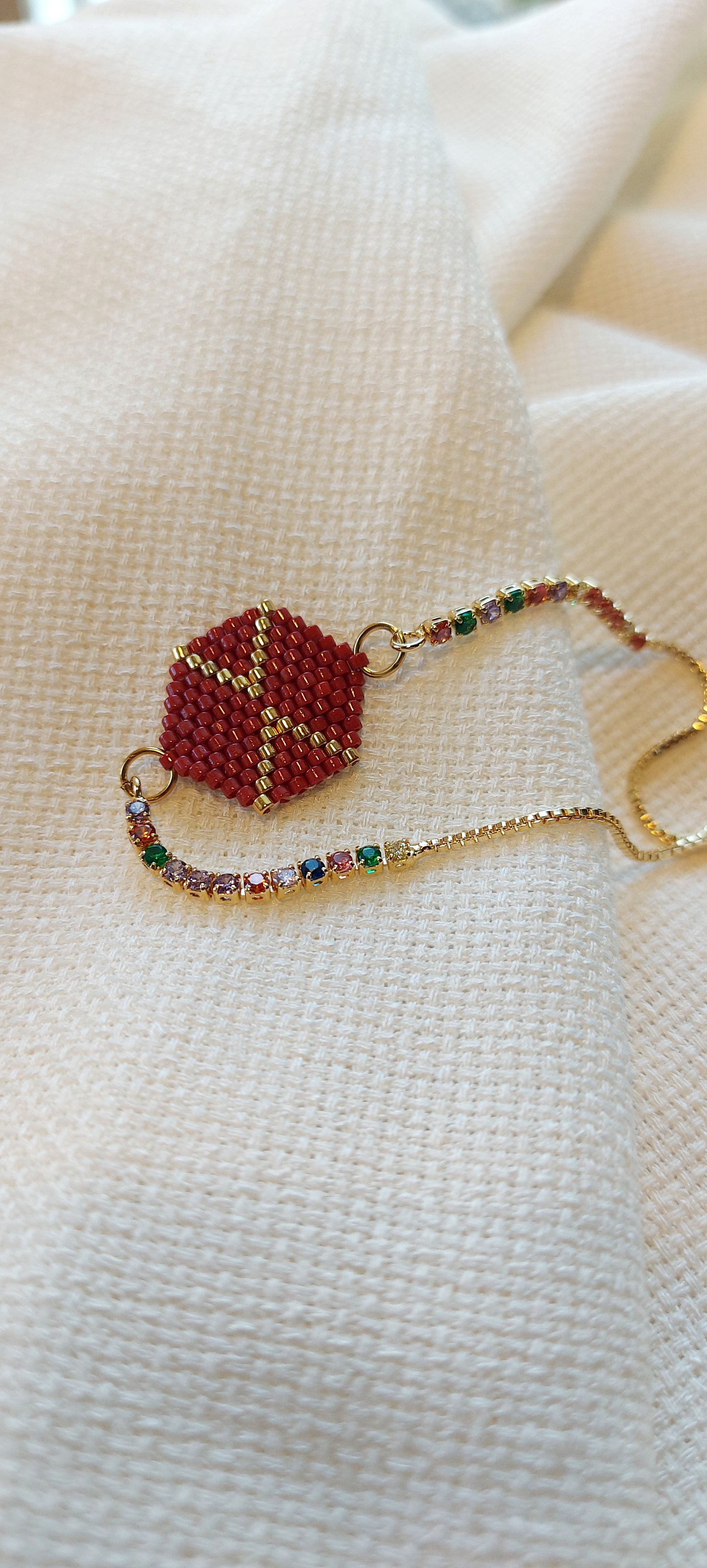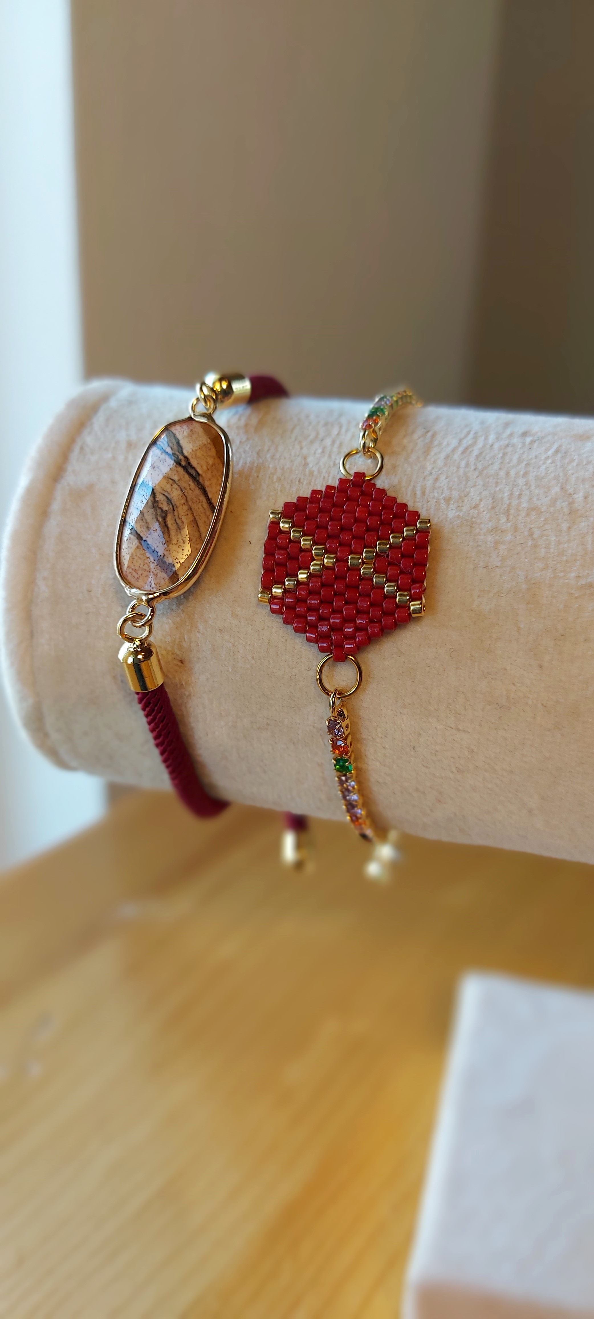 ست دستبند یک عدد دستبند بند آسانسوری استیل با پنل منجوقبافی منجق میوکی آبکاری طلا یک عدد دستبند بند آسانسوری با خرجکار برنجی و سنگ طبیعی